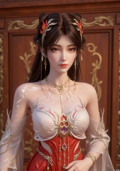 The image depicts a digitally rendered character with intricate and ornate attire. The character has long, dark hair styled in an elegant manner, adorned with golden and red decorative elements that resemble leaves or floral motifs. The character is wearing a detailed, white and red outfit with a delicate, intricate design, and a matching necklace with a central pendant. The background features a wooden panel with golden patterns, suggesting a traditional or historical setting. The overall aesthetic is highly detailed and artistic, with a focus on the character's elaborate appearance.,zichu-TS-huolinger