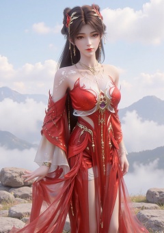 The image depicts a character standing against a backdrop of a cloudy sky. The character is dressed in an elaborate red and white outfit, adorned with intricate designs and gemstones. The outfit includes a sleeveless top with flame-like patterns and a flowing skirt. The character has long, wavy hair, styled with red and white accessories, and is wearing multiple bracelets and necklaces. The background features a serene, cloudy sky with distant mountain peaks.