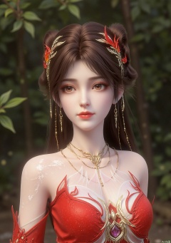 The image depicts a digitally rendered character with long, dark hair styled in an elegant manner, adorned with intricate red and gold accessories. The character is wearing a red garment with white and gold designs, which appear to be inspired by traditional or fantasy-themed aesthetics. The background is a natural setting with blurred greenery, suggesting an outdoor environment. The character's expression is calm and composed, with a slight smile.