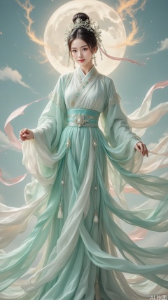 This is a full body picture of a girl. She is born with icy muscles and jade bones, her eyebrows are like distant mountains of indigo, and in a light sweep, they look like ink and wash blending; A pair of almond eyes, like glass soaked in moonlight, with a hint of light blush at the end of their eyes, looking forward like autumn water ripples. The nose bridge is as delicate as a jade carving, and the lips are like newly bloomed cinnabar peonies, with a hint of a cold smile before speaking. Her cheeks were as smooth as sheep fat jade wrapped in a thin cherry color, and her earlobes hung with a pair of pendants wrapped in tourmaline, reflecting a faint light as she walked lightly. Hairstyle and accessories: A "Nine Luan Moon Chasing Bunch" is made of green silk, with a triple cloud vortex pattern silver silk base wrapped around the top and center, and a diagonal insert in between: a "tired silk point emerald green Luan holding a pearl and swaying step by step": the tail feathers of the L,A beauty in ancient China