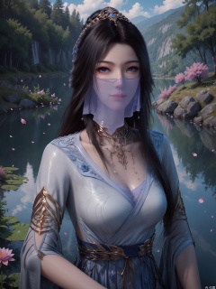 score_9,score_8_up,score_7_up,1girl,looking_at_viewer,realistic,1girl,Vivid Colors,bright environment,sunshine,god light,lake,delicate water surface,shiny skin,shiny hair,reflection,(wariza:1.2),dress,jewelry,flower sea,falling petals,extreme detail description,bright sunlight,frontal lighting,(upper body:1),put one hand on your chest,black-hair,veil