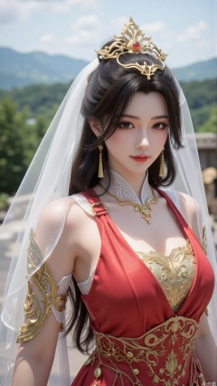 1girl, veil, dress, solo, jewelry, hair ornament, red dress, black hair, earrings, looking at viewer, mischevious smile, perfect body, scenery, sharp focus, best quality, masterpiece, detailed outfit, illustration, perfect eyes, finely detailed beautiful anime eyes, realistic skin, intricate details, best lighting, depth of field, ultra high resolution,cowboy shot