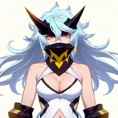 masterpiece, best quality,solo,(white background:1.2),simple background,looking at viewer, scarf,single thighhigh,boots,japanese armor,leotard,mask,gauntlets,armor,red eyes,hair between eyes,cleavage,messy hair,earrings,gloves,navel,horns,bare shoulders,1girl,white hair,breasts,<lora:死士-双刀型-ill:0.8>