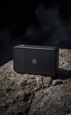 Photo of a small,rectangular,black,modern Bluetooth speaker sitting on a rough,rocky surface. The speaker has a grid-like pattern on its front and a subtle logo. The background is dark and out of focus,with a moody,atmospheric feel. The lighting is soft and dramatic,casting shadows and highlighting the textures of the rocks and the speaker.
