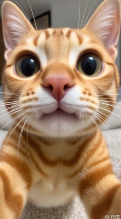 WALLPER, a medium-angle shot ,Ultra wide angle lens selfie, photo, photography, realistic photo, orange cat close-up, it has a pair of smooth big eyes and a small black nose. This photo has a slight blur and a soft focus