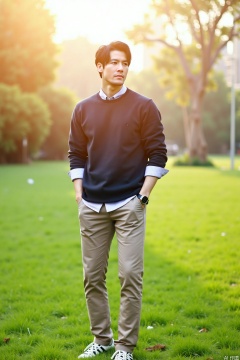 Under the warm spring sun, an Asian male model stands on the lush green grass, with a tall and straight posture, posing with one hand in his pocket. The depth-of-field effect blurs the background to highlight his handsomeness.