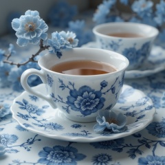 <lora:YY青花瓷F.1:1>,blue and white porcelain style,flower, cup, tea, creative photography, collage of colors in the image, stream of consciousness, hazy, psychedelic, golden ratio, delicate and simple, high-end feel, healing, grainy texture, film photograph, diffused gradient, elegant, romanticism, sense of story, sense of design, mysterious color, mysterious light, Leica filter, blur, high definition, clean