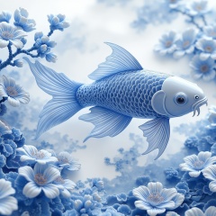 <lora:YY青花瓷F.1:1>,blue and white porcelain style,The illustration is highly detailed and realistic,with a smooth,glossy texture,a koi fish in a serene aquatic environment. The koi fish is the central subject, positioned slightly to the right, facing the viewer. It is a vibrant blue, with intricate scales that shimmer and reflect light, giving it a glossy appearance. The fish's eyes are large and round, with a gentle expression, and its mouth is slightly open, revealing its sharp teeth. The background features a soft, ethereal blue, with delicate petals of flowers and foliage, creating a dreamy, otherworldly atmosphere. The petals are rendered with fine, detailed brushstrokes, adding a sense of texture and depth to the scene. The flowers and plant life surrounding the koi are also in soft, pastel shades of blue and white, enhancing the tranquil and peaceful mood.