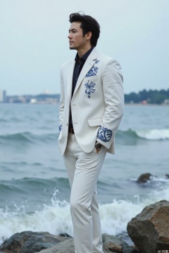 A debonair handsome man stands on a seaside rock, his hair slightly tousled by the sea breeze, and his gaze deep and focused. He wears a white suit with exquisite blue embroidery on the cuffs and collar, paired with a dark blue tie. With his hands behind his back, he gazes at the distant horizon, while white foam from the waves churns beneath his feet. The image is captured with a Sony A7R III, at an aperture of f/4, shutter speed of 1/200 second, and ISO 200. The overall tone is cool, creating a tranquil and mysterious atmosphere, with a slight graininess, as if immersed in an oil painting.,motion blur effect,cinematic texture background