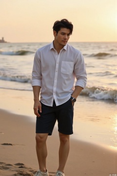 Under the setting sun by the sea, a handsome man stands on the beach, his silhouette gilded by the sunset. A close-up shot captures his strong jawline and slightly narrowed eyes. He is wearing a loose white linen shirt paired with dark blue shorts and canvas shoes, with the shirt's hem gently fluttering in the wind. With his hands in his pockets and a slight bow of his head, he appears to be lost in thought. In the distance, the shimmering sea waves lap gently against the shore, creating a tranquil and romantic atmosphere. Shot with a Fujifilm X-T4 camera, aperture f/2.2, shutter speed 1/100 second, and focal length 56mm. The overall tone is warm, with a soft orange hue to create a cozy ambiance.,jzns,saz,motion blur effect,cinematic texture background