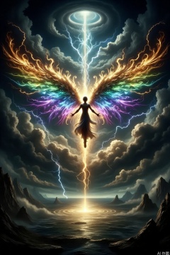 In the center of the image, a tall and upright figure hovers in the air with arms outstretched. Behind the figure is an extremely large and dazzling pair of wings. The feathers are intertwined with colorful glows such as gold, green, blue, and purple, shining brightly. The figure is surrounded by flashing electric light. Above, dark clouds churn in the sky, with a mysterious energy vortex in the center emitting a strong light. Below is a sparkling sea and rugged land. The overall scene creates a sacred, awe - inspiring, and fantastically powerful atmosphere.
