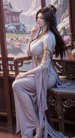 SFW,(masterpiece, best quality:1.2),1girl, solo, long dress,Ancient princess's boudoir with bright color palette, Hanfu-clad maiden sitting by latticed window desk in romantic daydreaming posture, classical Chinese garden through window showcasing lotus pond filled with blooming pink and white lotuses, delicate ink-wash painting style, interior featuring rosewood furniture with mother-of-pearl inlay, silk curtains fluttering in breeze, porcelain stationery set on desk, distant view of curved bridges and pavilions in garden, ultra HD rendering with crisp details on embroidered garments and translucent lotus petals,,(huge breasts:2.99),(full breasts:2.89),