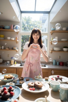 In the open-plan kitchen, a girl is wearing a cute apron and standing in front of the countertop, with freshly made desserts in front of her. The sunlight pours down from the skylight, illuminating her joyful face. She is holding a spoon in one hand and making a heart shape with the other, posing happily for the camera. Behind her, the cabinets and tableware are arranged in a disorderly but orderly manner, with the depth-of-field effect maximized, making the character come alive on the paper.plns,surrounded by bubbles