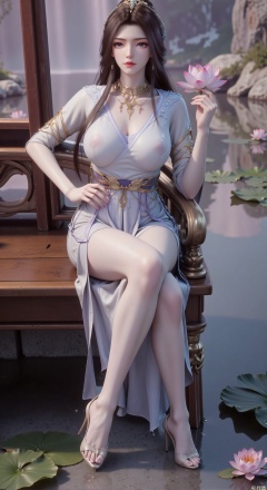 SFW,(masterpiece:1.2),best quality,The image is a digital illustration of a young woman sitting on a wooden bench in a pond with lily pads. She is wearing a long dress with design on the chest and sleeves. The dress has a high neckline and short sleeves,Holding a lotus in hand. She has long dark hair styled in loose waves and is wearing gold high heels. The woman is posing with one hand on her hip and the other resting on the edge of the bench. The background is filled with pink and white lotus flowers and green leaves. The overall mood of the image is peaceful and serene,(huge breasts:2.99),(full breasts:2.99),(Background with traditional Chinese architecture, lotus pond and pink lotus flowers:1.39),