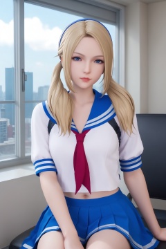 score_9_up,1girl,solo,sitting,window,frills,sky,cloud,indoors,cityscape,closed_mouth,sunset,looking at viewer,<lora:枪神纪-凌Pony:0.6>,long,straight blonde hair,two pigtails,a traditional Japanese schoolgirl uniform,featuring a white sailor-style top with blue trim and a red neckerchief,and a matching blue pleated skirt.,