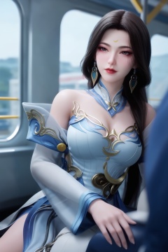 solo,1girl,fair_skin,white_skin,shiny_skin,Ivory_skin,solo focus,(perfect_face:1.2),(perfect_anatomy:1.1),(upper_body:1.2),(portrait:1.1),large breasts,sitting,(train_interior:1.1),(blurry_background:1.2),score_9,<lora:师兄-姮娥Pony:0.7>,long,dark hair,a pair of gold hairpins,an ornate dress in a light blue hue that is intricately designed with gold and silver accents. long,flowing sleeves,high collar,