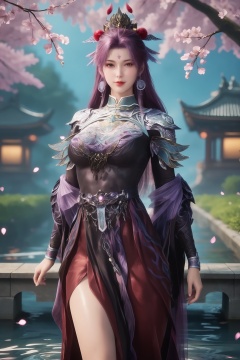 score_9,high detail,best quality,cinematic lighting,volumetric lighting,shiny skin,shiny,looking_at_viewer,close-up,BREAKfair_skin,white_skin,shiny_skin,Ivory_skin,(looking at viewer:1.1),(cinematic lighting:0.9),(volumetric lighting:0.9),solo focus,large_breasts,(perfect_face:1.2),(perfect_anatomy:1.1),Tranquil garden pond surrounded by cherry blossoms,Vibrant cherry blossom park in full bloom,day,suneate,<lora:牧神记-司幼幽Pony:0.7>,long,purple hair,golden crown,a ornate purple and gold embroidery dress,armor,high collar,elaborate sleeves,flowing skirt,a belt,a small pendant dangles,