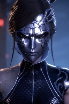 This is a highly detailed CGI rendering of a futuristic warrior,portrayed in a dramatic,close-up,low-angle perspective. The subject is a humanoid figure with a metallic,armor-like skin and a helmet that covers the face,giving it a sinister,robotic appearance. The helmet has a sleek,shiny surface with intricate,web-like patterns that reflect the light,creating a mesmerizing,almost ethereal effect. The eyes are highlighted by a piercing blue light,giving a sense of intensity and intelligence. The warrior's hair is short and styled in a way that fits the futuristic aesthetic.,The background is a dimly lit,misty environment,with a hint of a castle-like structure visible in the distance,adding an element of mystery and depth. The colors in the scene are predominantly cool,with blues,purples,and silvers dominating,enhancing the futuristic theme. The textures of the armor and the misty background are highly detailed,with a glossy,metallic sheen on the armor and a soft,diffused quality to the mist. The overall mood is one of otherworldly,high-tech intrigue,with the warrior's imposing presence dominating the frame.,<lora:秦时明月S6-女刺客Pony:0.7>,metallic,(spiderweb-like mask,mask covers  face:1.2),