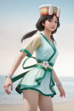 realistic style photo outstanding style,tall,cute,in her teens. Use soft lighting to cast gentle shadows on the subject,adding a touch of dimension to your images without compromising details,score_9,score_8_up,score_7_up,Seaside,beach,waves,<lora:仙剑奇侠传x联动-阿奴v5Pony:0.7>,dark brown hair is styled in two loose pigtails,wears a headpiece adorned with a red and gold,wearing a traditional kimono,which is light blue with a green sash and intricate white floral patterns.,