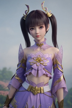realistic style photo outstanding style,tall,cute,in her teens. Use soft lighting to cast gentle shadows on the subject,adding a touch of dimension to your images without compromising details,score_9,score_8_up,score_7_up,looking at viewer,upper body,<lora:斗破苍穹-紫妍Pony:0.6>,1girl,dark brown hair is styled in two high ponytails adorned with golden accessories.  wearing a fantastical,ornate outfit that includes a sleeveless,strapless top with intricate,gold detailing,a matching skirt,and thigh-high boots.,