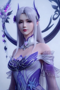 realistic style photo outstanding style,tall,cute,in her teens. Use soft lighting to cast gentle shadows on the subject,adding a touch of dimension to your images without compromising details,score_9,score_8_up,score_7_up,looking at viewer,upper body,<lora:小医仙斗尊:0.8>,1girl,solo,long hair,dress,hair ornament,detached collar,bare shoulders,see-through,white hair,purple dress,detached sleeves,jewelry,