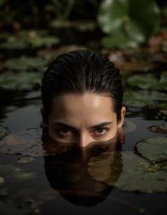 Cinematic-style photograph, digital medium. Close-up of a woman partially submerged in water with intense, expressive eyes peering above the surface. Streamlined dark hair slicked back, reflecting natural light. Surrounding environment features lily pads and blurred aquatic background with rich, earthy greens and muted browns. Dramatic play of light and shadow on water and woman's face creating a mysterious ambiance. High contrast, meticulous detail, capturing an enigmatic, suspenseful moment.
