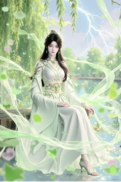 The whole picture combines soft willow leaves, willow branches and shocking lightning, showing the harmonious coexistence between nature and people, with both a beautiful artistic conception and a touch of dramatic tension. 1 girl, solo, long hair, black hair, hair accessories, long sleeves, dresses, jewelry, green eyes, earrings, belts, Hanfu, solo, long hair,  hair accessories, dresses, whole body, green high heels, belts, green dresses, Hanfu, streamers.