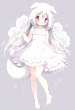 shiratama_(shiratamaco),1girl,:o,albino,animal_ears,bare_shoulders,barefoot,blush,bone_hair_ornament,cartoon_bone,commentary,dog_ears,dog_girl,dog_tail,dress,floral_background,frilled_dress,frilled_gloves,frills,gloves,grey_background,grey_hair,hair_between_eyes,hair_ornament,hand_up,highres,long_hair,original,parted_lips,red_eyes,shiratama_\(shiratamaco\),sleeveless,sleeveless_dress,solo,symbol-only_commentary,tail,twitter_username,very_long_hair,white_dress,white_gloves, white_gloves<lora:shiratama_cyan-000012:0.8>