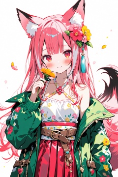 loli 1girl solo red eyes animal ears smile long hair off shoulder bare shoulders tail fox ears hair ornament looking at viewer long sleeves white hair closed mouth holding flower fox tail multicolored hair jacket very long hair sleeves past wrists belt open clothes japanese clothes hand up sheathed hakama skirt skirt floral print brown belt red hair hakama nail polish open jacket streaked hair fox girl blush lantern blue nails sword sheath kimono buckle breasts red skirt weapon belt buckle white background pleated skirt transparent background blunt bangs red flower halterneck red hakama pink hair black jacket two-tone hair heart tassel sleeveless animal ear fluff coat circle petals sidelocks collarbone pink flower red nails fingernails obi standing wide sleeves medium breasts dress upper body green jacket cowboy shot sash open coat tail raised yellow flower,<lora:lp23-000051:0.8>,