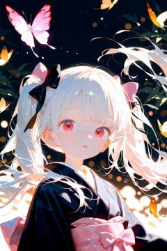 1girl, solo, long hair, looking at viewer, blush, bangs, red eyes, long sleeves, bow, twintails, very long hair, upper body, white hair, hair bow, parted lips, japanese clothes, kimono, blurry, :o, black dress, black bow, floating hair, depth of field, animal, bug, pink bow, butterfly, black kimono<lora:A420.1024alens2-000036:0.8>,