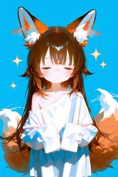 1girl, solo, long hair, blush, bangs, simple background, brown hair, shirt, long sleeves, animal ears, closed mouth, tail, closed eyes, white shirt, off shoulder, animal ear fluff, sleeves past wrists, fox ears, sparkle, :3, fox tail, blue background, fox girl, facing viewer, sleeves past fingers, = =, chopsticks, oversized clothes, afterimage, oversized shirt<lora:A420.1024alens2-000036:0.8>,