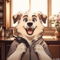 looking at viewer, open mouth, indoors, furry, animal, dog, meme, animal focus, whiskers,Fur_soft