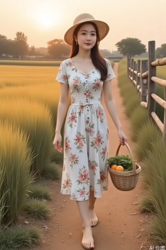 (masterpiece, best quality:1.3), rural Chinese beauty with healthy sun-kissed complexion, wearing simple floral cotton dress and straw hat, standing in golden wheat field at sunset, carrying bamboo basket with fresh vegetables, barefoot on dirt path, rustic wooden fence in background, warm sunlight casting soft glow on her rosy cheeks --v 6 --ar 4:3