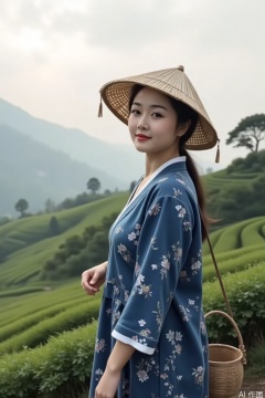 (masterpiece:1.2), a 20-year-old She girl wore an indigo batik short coat, a bamboo hat hangs tassels, and a vine basket stands in the fog tea mountain. Morning light penetrates the clouds to form a Dingal effect. A close-up of tea buds with fingertips touching the hidden tea buds, shallow depth of field blurs the terraces in the distance, soft focus treatment creates a hazy poetic meaning --v 6 --ar 3:4