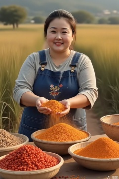 (motion blur:1.1), The moment when a 30-year-old peasant woman threw hot peppers, the navy blue apron and the golden corn stand formed a contrasting color, the flying pepper grains formed a visual guide line, and the sunlight shone on dust to form light mist, retaining the dynamic trajectory of the blurring of the bamboo sieve --v 6 --ar 9:16