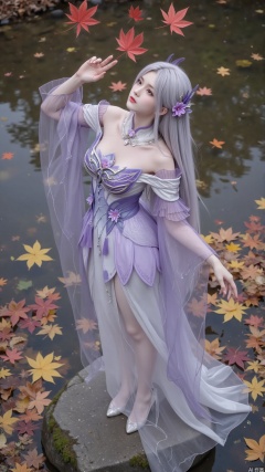 Composition: Adopting a vertical composition method, this composition can cleverly combine the main character with rich environmental elements within a limited frame. The woman is located in the center lower position of the picture, highlighting the subject and leaving space for the red maple leaves falling from above and the surrounding fallen leaves, creating a sense of hierarchy and depth in the picture. Maples. Water pool. Clear and transparent water. A stone covered in moss. Clear and transparent water. Maple leaves floating on the water.