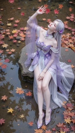 Composition: Adopting a vertical composition method, this composition can cleverly combine the main character with rich environmental elements within a limited frame. The woman is located in the center lower position of the picture, highlighting the subject and leaving space for the red maple leaves falling from above and the surrounding fallen leaves, creating a sense of hierarchy and depth in the picture. Maples. Water pool. Clear and transparent water. A stone covered in moss. Clear and transparent water. Maple leaves floating on the water.