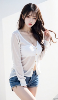 Theme description: A beautiful woman with flowing long hair was wearing a low-cut translucent white shirt and denim shorts standing sideways, with a pure white background setting off her body contour. Aesthetic description: Natural soft light highlights the translucent texture of the shirt, denim fabric presents delicate texture, and hair flutters naturally with the wind. Professional description: Ultra-high-definition commercial photography, 8K resolution, professional model body control, background blur and soft transition, shooting with Fuji GFX100 camera