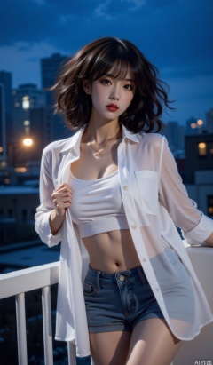 Theme description: Curly hair model wears a translucent white shirt with rosted denim shorts against the roof railing, and one-handed lifting of silk to expose the neck line
