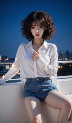 Theme description: Curly hair model wears a translucent white shirt with rosted denim shorts against the roof railing, and one-handed lifting of silk to expose the neck line