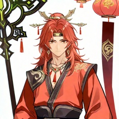 masterpiece, best quality,solo,(white background:1.2),simple background,looking at viewer, lianshan,jewelry,1boy,male focus,red hair,long hair,necklace,armor,messy hair,chinese clothes,circlet,hair ornament,bangs,boots,weapon,headband,earrings,pants,red shirt,<lora:连山-ill:0.8>