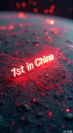 WALLPER, A surreal spatial scene captured from a medium angle with a realistic rendering style. World map. The background is a map of China occupying the large image, presenting exquisite continental contours and ocean textures. The glowing "1st in China" three-dimensional text above it, emitting a red neon glow and creating a sci-fi atmosphere. The overall color blends cold space and warm light text, highlighting the futuristic sense of space exploration.