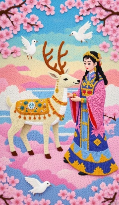 The image depicts a serene and ethereal scene with a woman in traditional attire, adorned with intricate patterns and jewelry, standing beside a majestic white deer. The deer is decorated with golden ornaments, and the woman appears to be gently touching its head. The background showcases a beautiful sky with soft pastel colors, suggesting either dawn or dusk, and is filled with cherry blossoms in full bloom, creating a sense of tranquility and harmony. A few white birds are flying gracefully, enhancing the peaceful atmosphere. The overall composition is harmonious, blending natural elements with cultural aesthetics.,knitting