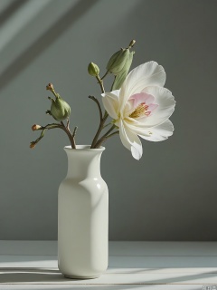 A photograph of a serene scene with a branch of magnolia blossoms in a low, wide vase, positioned diagonally on a light wooden deck. The blossoms are large and creamy white, with a hint of pink at the edges. The background is a soft, greenish-gray, enhancing the flowers’ natural beauty. Soft, natural light filters through the blossoms, casting delicate shadows on the deck.
