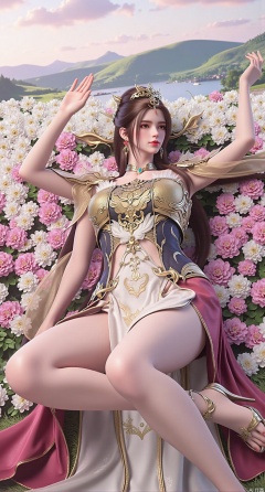 SFW,(masterpiece:1.2),best quality,absurdres,masterpiece,original,extremely detailed wallpaper,perfect lighting,This is a digital illustration featuring a beautiful,young Asian woman with a slender,elegant physique. She is lying on her side in a lush,white and pink flowers.(huge breasts:2.99),(full breasts:2.99),Her long,dark hair is styled in a high ponytail,adorned with a delicate,floral hair accessory. She has fair skin and striking red lips,with a serene,slightly seductive expression. Her attire is a revealing,fantasy-style dress with intricate lace and beading details,highlighting her ample breasts and slender waist. The dress has a sheer,flowing quality,with a detached sleeve and a high slit,revealing her toned legs. She wears matching high heels with intricate straps. The background features rolling hills and a distant lake,under a soft,pastel sky,creating a tranquil,dreamy atmosphere. The overall style of the illustration is highly detailed,