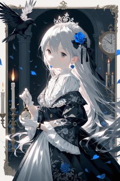 1girl, candle, bird, crow, solo, grey hair, grey eyes, flower, long hair, candlestand, gloves, fire, looking at viewer, earrings, jewelry, dress, white gloves, watch, blue flower, hair ornament, closed mouth, long sleeves, blush, very long hair, hair between eyes, grey dress, clock, candlelight, pocket watch, expressionless, floating hair, roman numeral, ribbon, holding, black ribbon, hair flower, black dress, feathers, breasts, animal, cowboy shot, white dress, rose, shirt, black bow, blue rose, hair ribbon, upper body, wide sleeves, chandelier, from side, floral print, bow, frills, burning, brown eyes, lolita fashion, sidelocks, outside border, grey gloves, standing, petals, wristwatch, hair bow, white shirt, looking to the side, hand up, crown, off shoulder<lora:lp24-000053:0.8>,