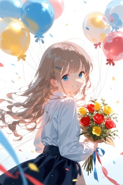 1girl, balloon, solo, bouquet, smile, looking at viewer, blue eyes, blush, long hair, holding bouquet, flower, holding, long sleeves, shirt, white shirt, looking back, upper body, hair ornament, grin, grey hair, red flower, confetti, yellow flower, ribbon, teeth, rose, blue ribbon, petals, floating hair, red rose, holding balloon, ahoge, white background, blue flower, looking to the side, red ribbon, from side, gradient background, from behind, light brown hair, backlighting, heart balloon, holding flower, simple background, hairclip, blurry, open mouth, sidelocks, brown hair, :d, streamers, bow, wind, blurry foreground, skirt, parted lips, wavy hair<lora:lp24-000053:0.8>,