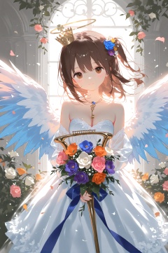 1girl, wings, solo, flower, dress, smile, hair ornament, brown hair, looking at viewer, bouquet, brown eyes, feathered wings, detached sleeves, white dress, angel wings, hair flower, blue flower, petals, blush, white wings, rose, holding, red flower, closed mouth, bare shoulders, long hair, holding bouquet, crown, instrument, angel, long sleeves, blue wings, white flower, pink flower, blue rose, red rose, medium hair, head tilt, harp, breasts, backlighting, purple flower, jewelry, key, sleeveless dress, mini crown, necklace, orange flower, standing, holding instrument, trumpet, cowboy shot, sleeveless, pink rose, white rose, ribbon, white sleeves, rose petals, leaf, hair between eyes, multicolored wings, medium breasts, wedding dress, short hair, one side up, frilled dress, sleeves past wrists, yellow flower, frills, floating hair, halo, strapless dress, scepter, cleavage, holding flower, falling petals<lora:lp24-000053:0.8>,