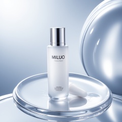 mids,A photograph of a white, cylindrical bottle with a silver cap, placed on a shiny, reflective surface. The bottle has a sleek, modern design with a glossy finish. The background is a gradient of blue and silver, with a circular pattern of smooth, reflective surfaces. The text on the bottle reads "MILUO" in a bold, black font. The overall aesthetic is minimalistic and minimalistic, with clean lines and a focus on the product.<lora:t-流体美妆v1.3:1>