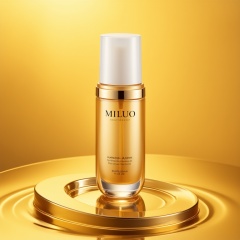 mids,Photo of a golden bottle with a white cap, placed on a shiny, golden circular surface. The bottle has a label with the brand name "MILUO" in bold, black lettering. The background is a gradient of warm, golden hues, creating a luxurious and elegant atmosphere. The lighting is soft and diffused, highlighting the bottle and its contents. The overall effect is one of sophistication and luxury.<lora:t-流体美妆v1.3:1>